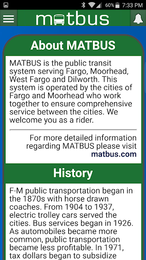 The MATBUS App is here. MATBUS has the tools to make traveling through the Fargo-Moorhead Metro area easy. Download today for live bus tracking, service notifications, and more.