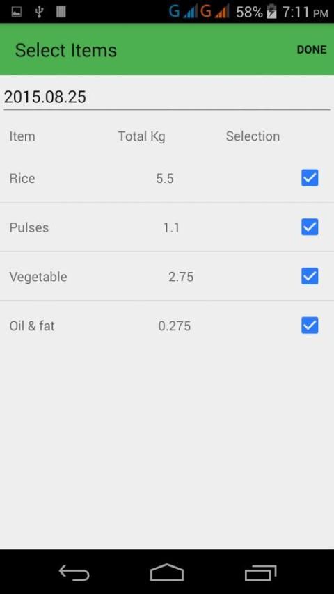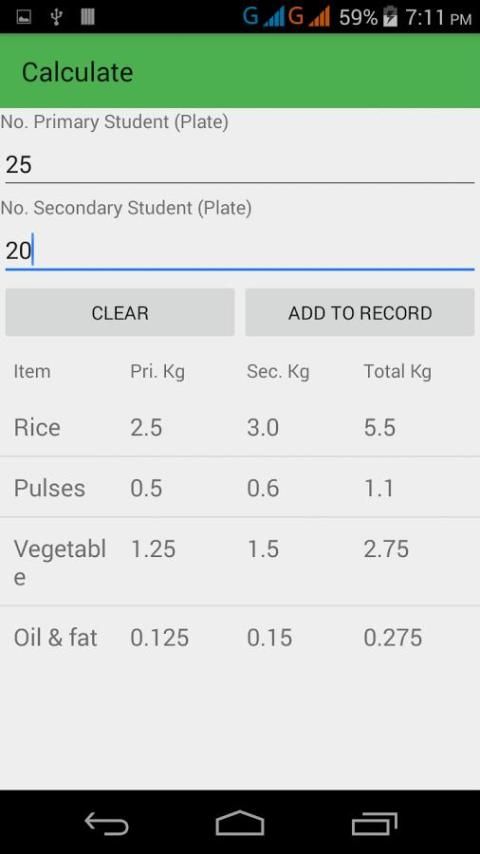 يمكنك حساب كل المعلومات المطلوبة من الاستخدام اليومي عن طريق ملء فقط عدد من الفتيان والفتيات من المرحلة الابتدائية والثانوية. لهذا كان لديك لملء جميع المعلومات الضرورية مثل الحبوب وغيرها من التفاصيل بما في ذلك البند في كمية غرام لكل طالب والسعر مرة واحدة فقط.