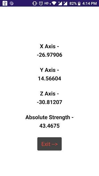 Take your phone anywhere and open the app it will tell the value of magnetic field strength along the X-axis ,Y-axis, Z-axis.
