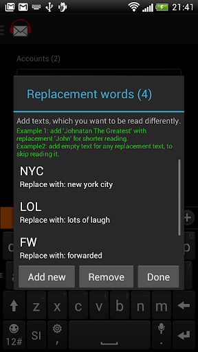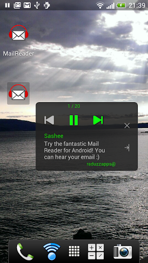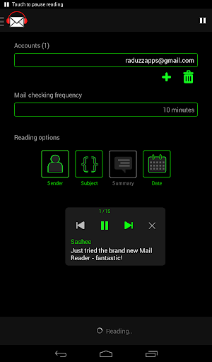 Mail Reader is convenient cyber mail assistant reading out your incoming emails while you work, drive, walk, or have your hands occupied. Besides sender, subject and email date, it can read summary of the email - usually first 10-15 words from the email body. The app contains floating control panel for comfortable listening with possibility to Pause, move to Next or Previous email. Included is also handy home screen widget - press it to listen to your new emails. You can start the reader also by plugging-in a headset. This and other features can be turned on/off in app's Settings. Mail Reader currently works exclusively with Gmail.