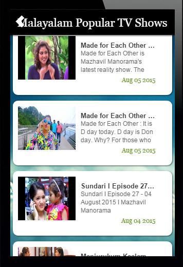 This application allows you to watch all your favorite Malayalam TV Channel shows at any time you wish to watch, this is the best application for watching LIVE shows in HD Quality.