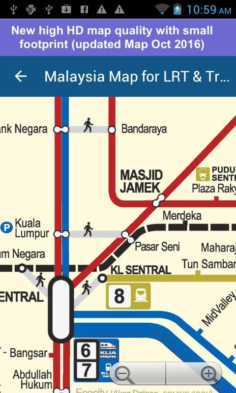 ماليزيا كوالالمبور قطار خريطة. ماليزيا قطار الخريطة للحصول على Komuter لل، LRT، مترو الأنفاق والقطارات الكهربائية - مفيدة عند السفر في كوالالمبور وادي كلانج. بدء العمل بسيطة، فقط تصفح محطة القطار من خريطة حاليا، أو البحث في المحطة باستخدام وظيفة التصفية. يمكنك أيضا الانتقال إلى أي محطة باستخدام خريطة.