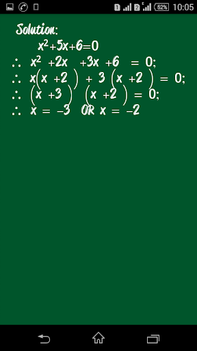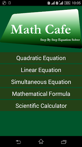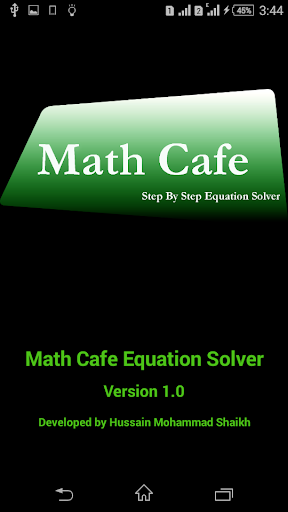 Step by step solution to Math Equations like Quadratic Equation, Linear Equation, Simultaneous Equation, and also has features like Mathematical Formula and Scientific Calculator. You just have to type the equation as you see in the Text Books, and it solves the problem step by step as it should be done. It's a great app to help you with your Maths Homework