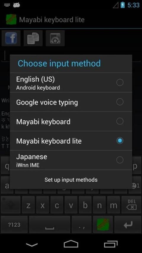 لتعيين كما الافتراضي: الضغط لفترة طويلة في حقل النص، وحدد "أسلوب الإدخال" ثم "لوحة المفاتيح Mayabi"