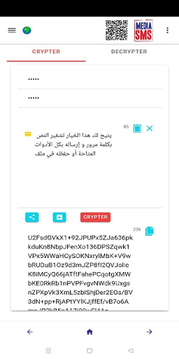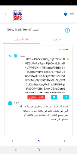 • تشفير(Doc, Mail, Texte): يتيح لك هذا الخيار تشفير النص و فك التشفير و إرساله عبر كل وسائل الإتصال المتاحة بهاتفك أو حفظه في ملف .
