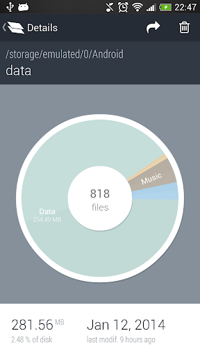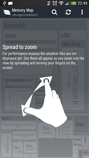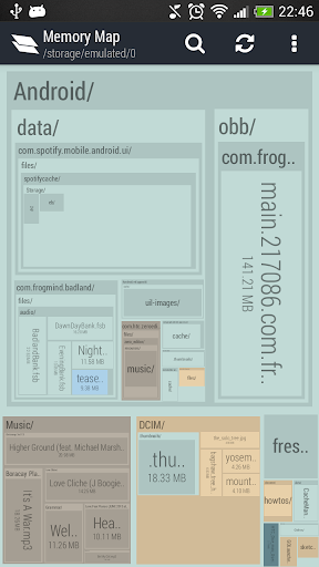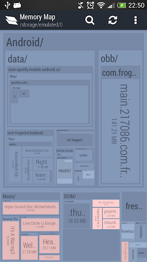 another cache cleaner. It focuses on bringing you an overall view of your disk and allows you to delete your *own* files (pictures, videos, musics...) as well as cache files. To do that, Memory Map is based on a interactive map of all the files and folders contained in your disk. The bigger a file is on the screen, the bigger it is on the disk, it's that simple!