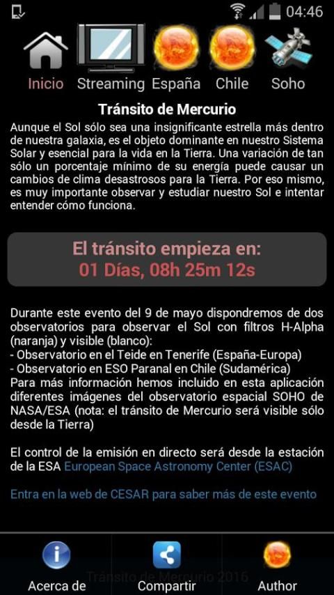 Sencilla herramienta para ver el Sol en directo durante las observaciones previas al tránsito y durante el tránsito de Mercurio que tendrá lugar el 9 de mayo del 2016. Además podrás acceder a un streaming en directo con la Agencia Espacial Europea donde nos contarán las últimas misiones de la ESA, información sobre el proyecto educativo CESAR y la estación en España de la agencia ESAC.