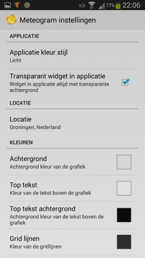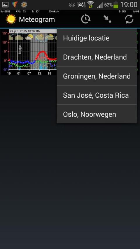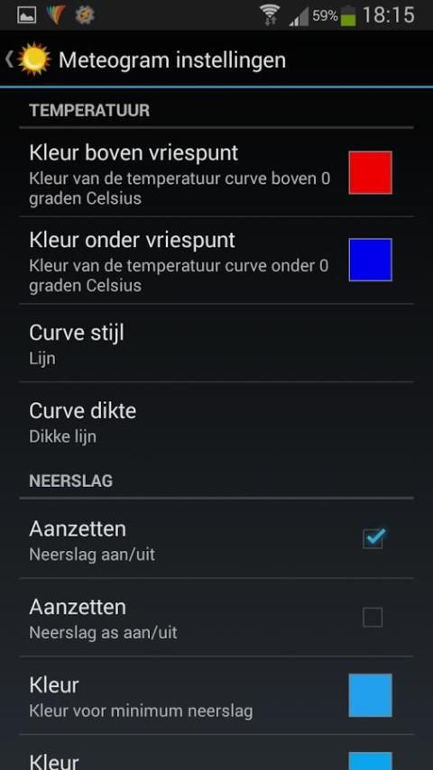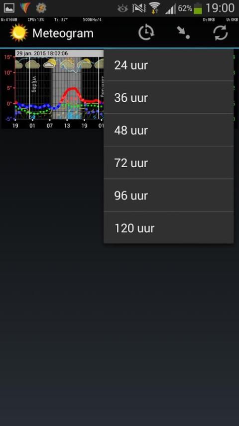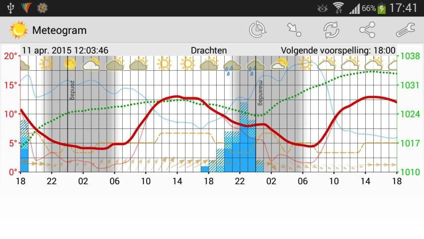 ويظهر التطبيق meteogram على الرسم البياني للتنبؤ بالطقس التيار أو موقع محدد مسبقا. الرسم البياني يحتوي على: