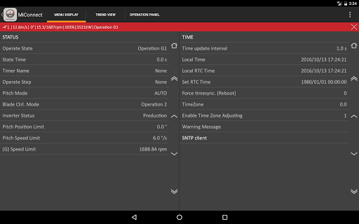 Operation Panel - enables the user to view measurements of principal characteristics of the unit operation, which is visually displayed in a panel with the presented measurements. Data for these characteristics is retrieved and updated in real-time mode. The user can monitor overall system status, principal mechanical and electrical characteristics of the unit, power characteristics and weather conditions.