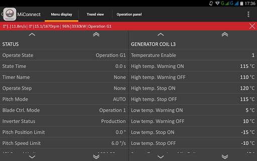In addition, it provides the possibility to make control modifications. The app connects to a controller directly or via the wind park network and is specifically designed to assist service officers who manage wind turbine operation on site.