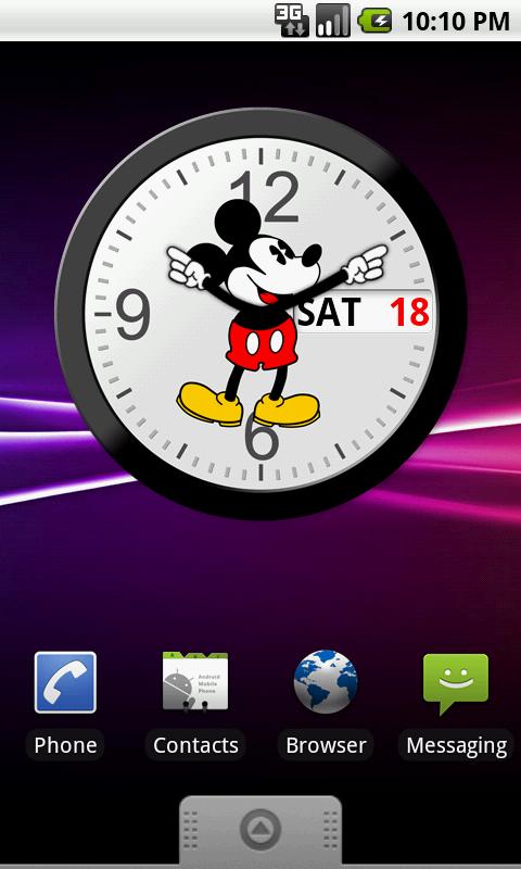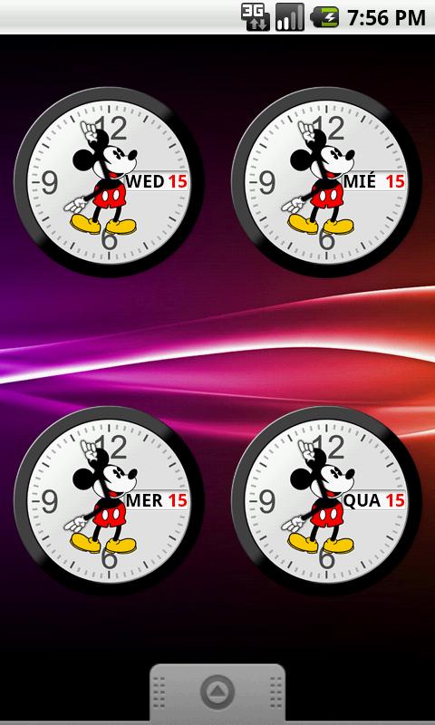 The world's most famous mouse, in an analog clock at your home screen.DONATEThis release is free, but if you really like it then please consider donate buying my "Office Analog Clock" app:https://market.android.com/details?id=br.com.letsbora.officeclockliteThanks a lot.IMPORTANT: After update, remove and add your clock again, otherwise date will not update!HOW TO INSTALL**This is a widget. No icon will appear on app drawer.**Add it by long press on the home screen, choose "Widgets" from the pop-up menu and scroll to find and choose "Mickey Mouse Clock".FEATURES* Shows date and week day* Week day in five languages: English, French, Italian, Portuguese or Spanish* Two sizes: small and large* Touch to launch Alarm ClockNOTES* There is no second hand due avoid performance and battery issues.* After a version update, remove it from the screen and add it back.* If you manually changes system date, wait few seconds to have the calendar updated.* There is no icon on app drawerDONATE!The release is free, but if you really like it then please consider donate buying one of my paid app. Thanks a lot.CONTACTComments or bugs reports. Email to: contact@letsbora.comEnjoyKEYWORDS: Analog Clock, Hands, Calendar, Brasil, Mickey Mouse, Relógio, Français, Español, Português, ItalianoRecent changes:IMPORTANT: After update, remove and add your clock again, otherwise date will not update!Version 1.2.0 - Fixed: Date updade module stoped by Android system.Version 1.1.1 - Spanish week days spell correction (thks José Roberto).Version 1.1.0 - Custom layout for small screen devices.Version 1.0.1 - English week days spell correction (thks Stephen).content rating: Everyone