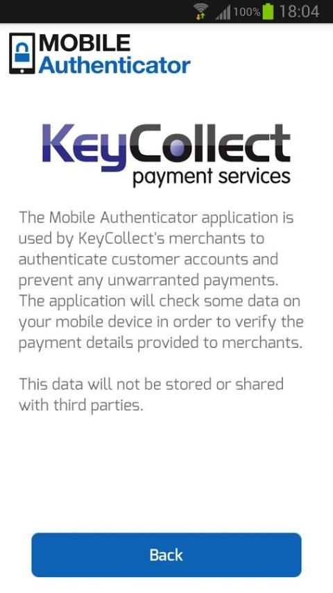 ويستخدم تطبيق أداة مصادقة المحمول من قبل التجار KeyCollect لمصادقة حسابات العملاء ومنع أي مدفوعات غير المبررة.