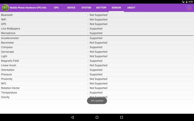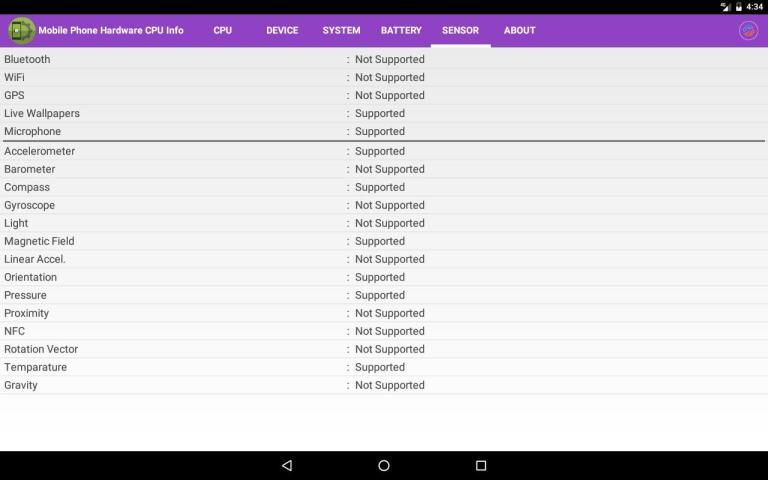 - مجسات معلومات: التقارير معلومات حول أجهزة الاستشعار مثل التسارع، والمغنطيسية، بارومتر، البوصلة، جيروسكوب، والضوء، الضغط، والقرب منها NFC، مجموعة، القرار، واستهلاك الطاقة.