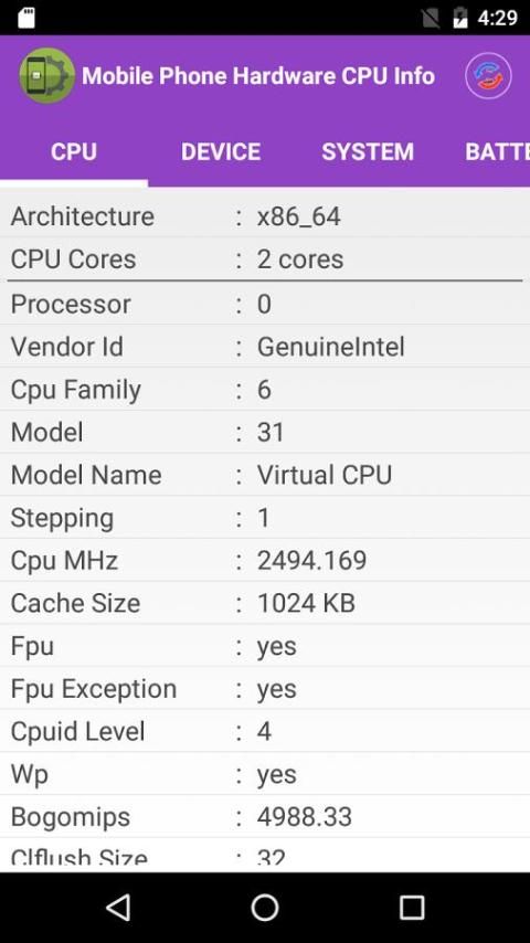 الهاتف المحمول الأجهزة وحدة المعالجة المركزية المعلومات هي أداة وحدة المعالجة المركزية وأجهزة المعلومات والتشخيص والتحليل لأجهزة الروبوت. الهاتف المحمول الأجهزة وحدة المعالجة المركزية معلومات يعرض معلومات مفصلة عن مكونات وحدة المعالجة المركزية، GPU والأجهزة من جهاز الروبوت. يكشف وحدة المعالجة المركزية، ذاكرة الوصول العشوائي، شرائح اللوحة الأم وغيرها من ميزات الأجهزة من الهاتف الذكي الروبوت الخاص بك، ويقدم المعلومات في عرض علامات التبويب بسيط.