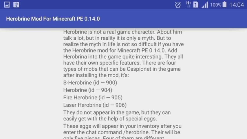 Herobrine ليس عبة ذات طابع حقيقي. عنه نتحدث كثيرا، ولكن في واقع الأمر ليست سوى خرافة. ولكن لتحقيق أسطورة في الحياة ليست صعبة للغاية إذا كان لديك وزارة الدفاع Herobrine لماين كرافت PE 0.14.0. إضافة Herobrina في لعبة مثيرة للاهتمام الى حد بعيد. لديهم كل الميزات الخاصة بها. هناك أربعة أنواع من الغوغاء التي يمكن Caspionet في المباراة بعد تثبيت وزارة الدفاع، هو: