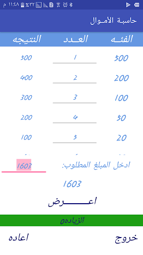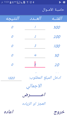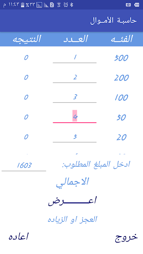• لاستخدام جيد للتطبيق ، يجب إدخال قيمة كل فئة من فئات العملة إن وجدت وإدخال المبلغ المطلوب من المال إن كنت تعرف قيمته الصحيحه من خلال فاتوره بيع او غيرها ، ثم الضغط على زر عرض.