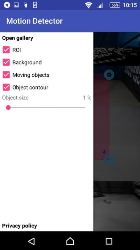 يستخدم كشف الحركة كاميرا الجهاز لالتقاط الأجسام المتحركة وحفظ الصور في المعرض. خيارات إضافية - اختيار العائد على الاستثمار، وتظهر الفرق قناع، كفاف الكائن ولا يزال الخلفية.
