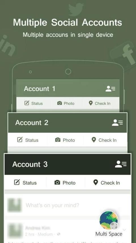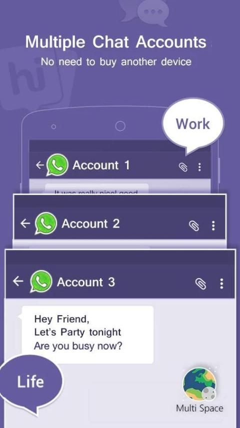 الفضاء المتعدد هو وسيلة سهلة الاستخدام والتطبيق للوصول موازية لحسابات متعددة مع التبديل السريع بين التطبيقات استنساخ والتطبيق المزدوج.