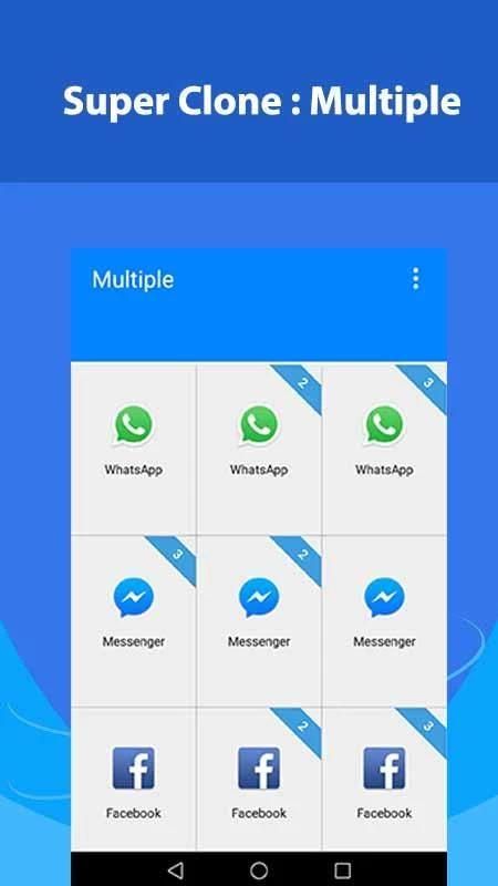 تم تصميم حسابات متعددة للمستخدمين الذين يربطون : فتح حسابين واتساب أو الفيسبوك في هاتف واحد في حين أن البيانات في حسابك الأساسي والتطبيقات الخاصة بك 2 واتساب في هاتف واحد .