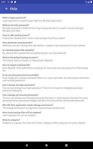 لتخزين بياناتك الشخصية (مثل كلمات المرور وأرقام الحسابات والملاحظات وغيرها بشكل آمن في هاتفك المحمول. هذا التطبيق لا يستخدم الإنترنت. لذلك لا تقلق بشأن بياناتك. لن تسرق.