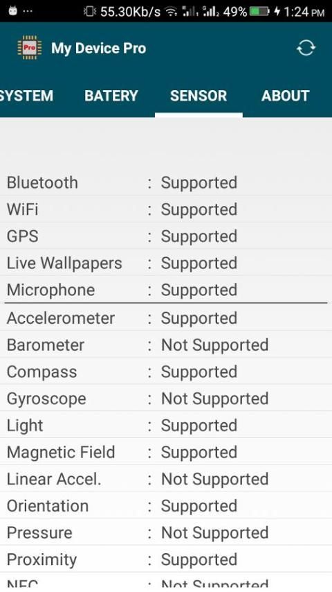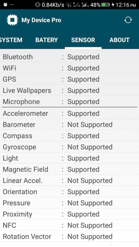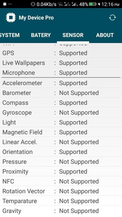 - مجسات معلومات: التقارير معلومات حول أجهزة الاستشعار مثل التسارع والمغنطيسية بما في ذلك مجموعة، القرار، واستهلاك الطاقة.