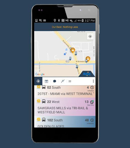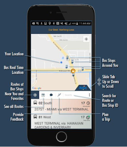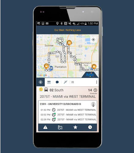 يرجى التخطيط لتكون في محطة الحافلات بضع دقائق في وقت مبكر، ووقت جدول الزمن ووقت الوصول المقدم من تطبيق MyRide Broward هو تقديرات