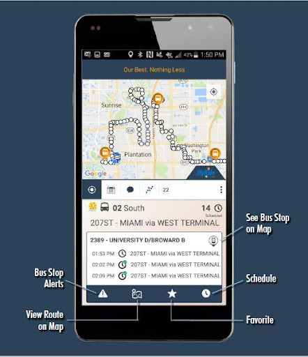 The MyRide Broward APP هو منتج معلومات في الوقت الفعلي لعملاء عبور مقاطعة Broward، ويوفر معلومات وصول الحافلة وموقع الحافلات وتخطيط الرحلات لجميع طرق حافلات مقاطعة Broward Transit.