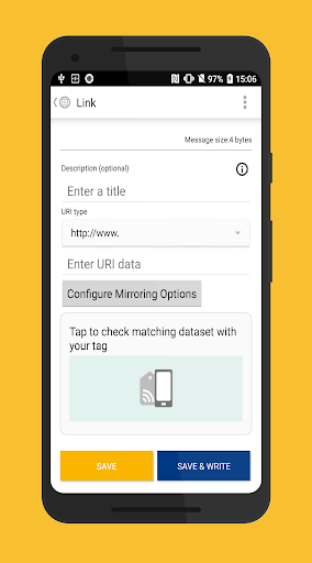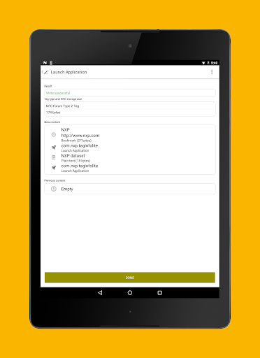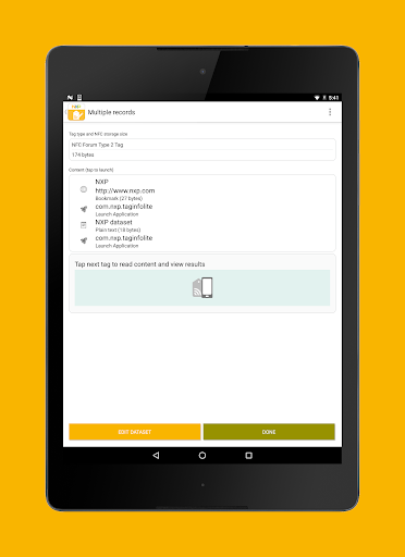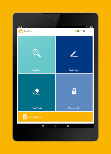 يقوم NFC TAGWRITER بواسطة NXP بتخزين جهات الاتصال والإشارات المرجعية والموقع الجغرافي وتسليم Bluetooth و SMS والرسائل النصية والرسائل النصية وغيرها الكثير إلى أي علامات تدعم NFC بالإضافة إلى عناصر مثل الملصقات وبطاقات العمل والساعات والعديد من العلامات التي تحتوي على NFCالإلكترونيات.بمجرد تخزين البيانات ، يتيح التطبيق أيضًا قراءة البيانات المبرمجة وعرضها بما في ذلك الخيارات لإطلاق التطبيقات تلقائيًا بناءً على البيانات الموجودة.بالطبع لا يسمح لك ببرمجة العلامات بالفعل.على أي حال ، يمكنك الآن إعداد مجموعات بيانات NFC على سبيل المثالعلى جهاز شاشة كبير ثم شاركه مع هاتف NFC ممكّن للاستفادة منها بالفعل.بالإضافة إلى أنه يمكنك التقاط عرض مسبق حول ما يمكنك القيام به مع هاتف يدعم NFC.