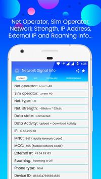 Net Operator, Sim Operator, Network Type (3G, 4G, LTE), Network Strength, Data State, Country Code, IP Address, External IP Address, Network Signal Speed Booster, Roaming Info, Phone Type, Device ID, Data Activity, Mobile Signal Info and many more details.
