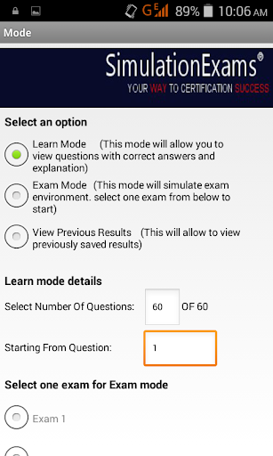 Complete explanation is provided for each question in Learn mode, and actual exam environment is simulated in Exam mode. Options to save the results and reviewing questions are provided.