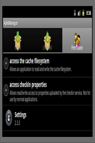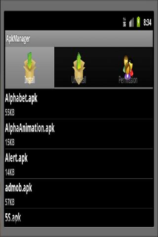 InstallUninstallView Permissions of Android application apk files.New Apk Manager will be helpful in installing non market android application from your SD card. Also you can uninstall the application. You can view the permission of installed apps. A very simple yet must have application for all the users.Keywords: Apk Installer Uninstaller View Permission of application Permission