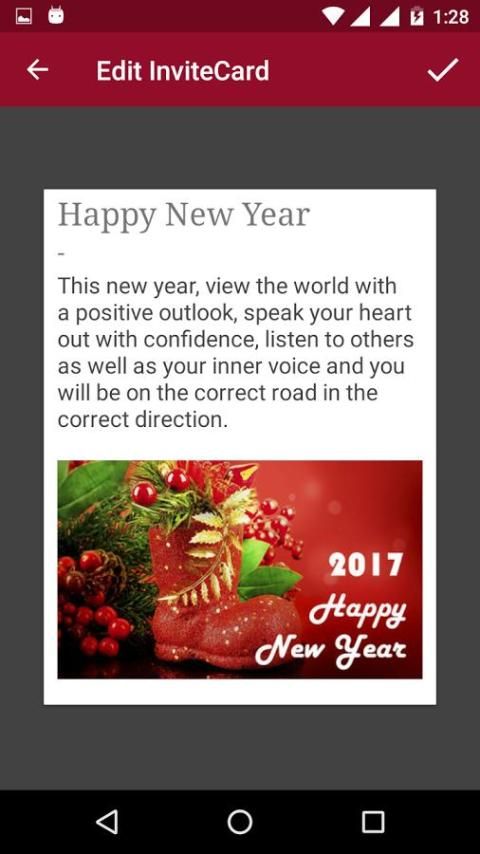 هناك الكثير من الناس الذين يبحثون عن السعادة تحيات العام الجديد على شبكة الانترنت. في هذا التطبيق يمكنك العثور تحيات جيدة رائعة لأقوال سنة جديدة سعيدة، سنة جديدة سعيدة 2017 التحيات. حتى تتمكن من حصة وإرسال بطاقات التهنئة بالعام الجديد لأحبائك ويمكنك توسيع الحب والتقدير لهم.