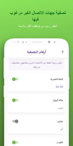 تمنحك الميزة المتميزة "من يمكنه التواصل معي" راحة البال لتلقي الردود فقط من التوفيقات المناسبة التي تتطابق تفاصيل ملفها الشخصي مع تفضيلات شريكك التي حددتها. باستخدام هذه الميزة ، يمكنك تعيين شروط مثل : الفئة العمرية والحالة الاجتماعية واللغة الأم والتعليم واللغة والإقامة.