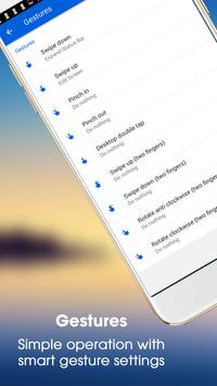 We add many gestures that you can create with your phone: swipe down (one or two fingers), swipe up (one or two fingers), pinch in, pinch out, desktop double tap, rotate anti clockwise, rotate clockwise. Each action will lead you to have a shortcut to what you set up on the app, allowing you to open favorite app or to edit system settings.
