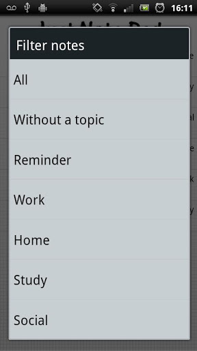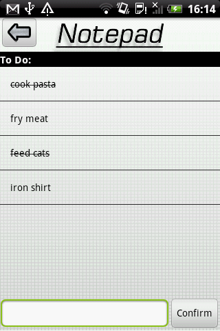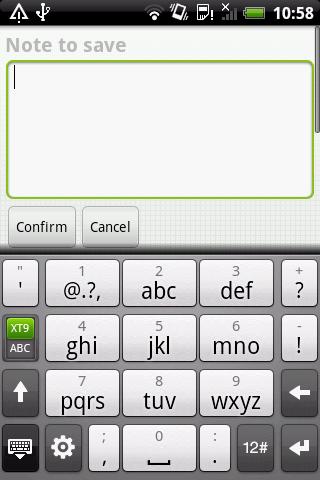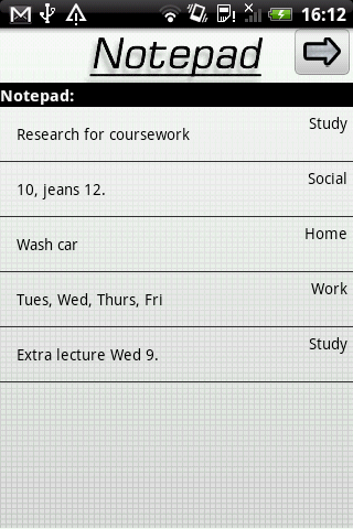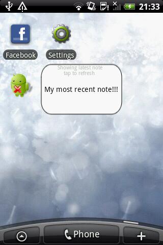 Create, update and delete notes in a number of seconds.An app that makes jotting notes as simple as possible. Create, update and delete reminders in a number of seconds.This application now features a simple widget that displays the latest note without opening the actual app.Any error reportswith version number please or feedbackupdate ideas are welcome.v1.1 Added an options menuv1.2 Added a widget that displays most recently added note Addresses some reported bugsv1.3: Added a tagging and filter function to separate notes into categories making it easier to find notes based upon type Addresses a reported database bugv1.4: Added a second page to do page, so temporary notes can be made and deleted on the same screen. Application Icons and Images updated Fixed an issue where notes disappeared on orientation changev1.5: Can now set a password to get access to notes Switching pages now more efficient
