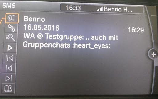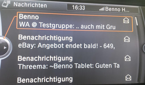 الرسائل علاوة على ذلكمن تطبيقات مثل WhatsApp والإشارة يمكن أن ترتبط مباشرة بجهة الاتصال ، حتى يمكنك الاتصال بالشخص أو إرسال رسالة SMS مرة أخرى (اعتمادًا على وظيفة المعلومات والترفيه).عرض الإخطارات من التطبيقات الأخرى في نظام سيارتك في نظامك ، يحتاج النظام إلى دعم لعرض رسائل الرسائل القصيرة في السيارة ( pluetooth-map profile! )
