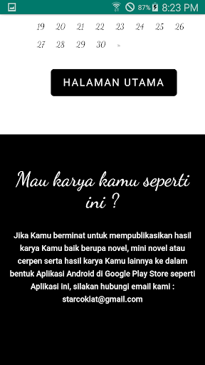إذا كنت مهتما بنشر عملك إما في شكل روايات أو روايات صغيرة أو قصص قصيرة وأعمالك الأخرى في النموذج من تطبيق Android على متجر Google Play مثل هذا التطبيق، يرجى الاتصال بالبريد الإلكتروني لدينا: Starcoklat@gmail.com