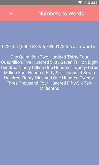 والأرقام إلى كلمات أيضا تحويل الكسور العشرية إلى كلمات ويمكن التعامل مع ما يصل إلى 123 عشريين كذلك.
