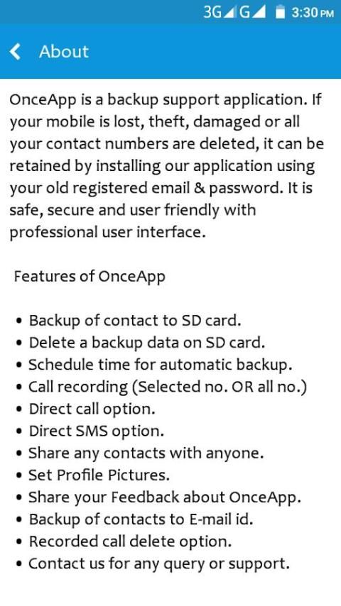 OnceApp is a backup support application. If your mobile is lost, theft, damaged or all your contact numbers are deleted, it can be retained by installing our application. It is safe, secure and user friendly with professional user interface.