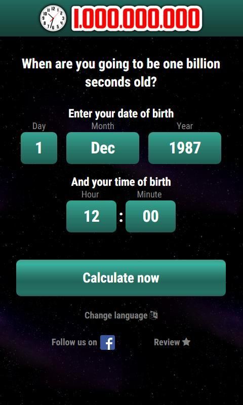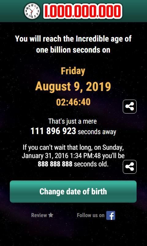 مع هذا التطبيق قليلا، ويمكنك حساب عندما كنت على وشك أن المليار ثواني العمر. فقط أدخل تاريخ ميلادك وقبالة تذهب. التطبيق يخبرك لحظة سيكون لديك عيد ميلادك ثانية واحدة مليار.