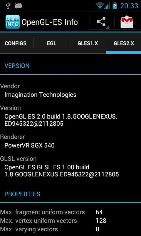 برنامج OpenGL ES-معلومات يتيح لك عرض المعلومات ذات الصلة حول تنفيذ برنامج OpenGL ES-جهازك. وتشمل البيانات: