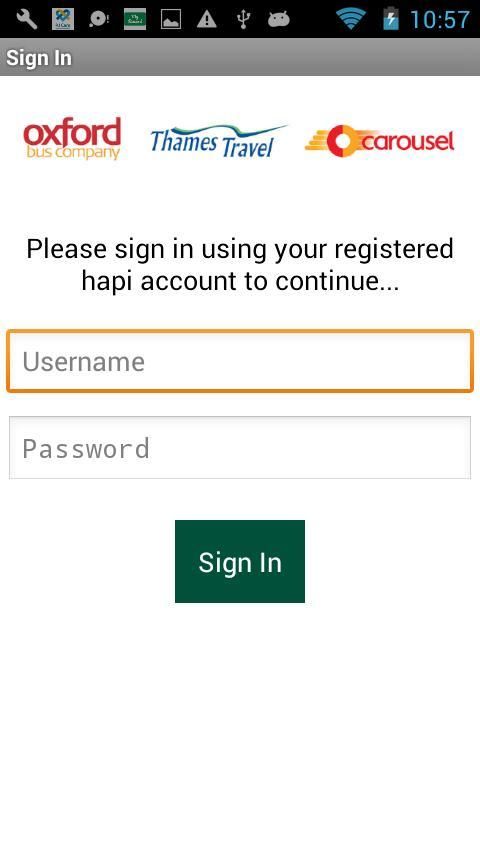 عند إطلاق التطبيق، تسجيل الدخول باستخدام بيانات الاعتماد نفسها التي تستخدمها لموقع oxfordbus.hapibenefit.com.