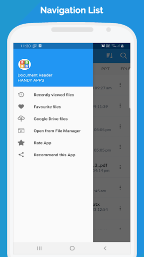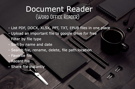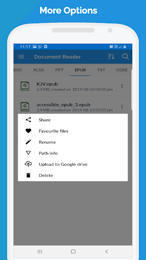 في هذا يمكنك عرضه ، قراءة ، إدارة & amp ؛شارك جميع المستندات المدعومة في هاتفك المحمول.يوفر أيضًا العديد من الوظائف التي أيضًا مع خيارات متعددة مثل المشاركة ، وحذف ، وإعادة تسمية ، وتحميل الملف إلى Google Drive ، وتفاصيل المسار ، والملف المفضل.