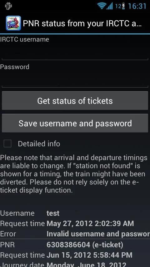 يمكنك أيضا إدخال اسم المستخدم وكلمة المرور IRCTC وأنها سوف تحصل على تذكرة من وضع جميع تذاكر قابلة للطباعة من حساب IRCTC الخاص بك. جميع الاتصالات مع اسم المستخدم وكلمة المرور الخاصة بك مشفرة تماما مع SSL، RSA و / أو طرق التشفير AES.