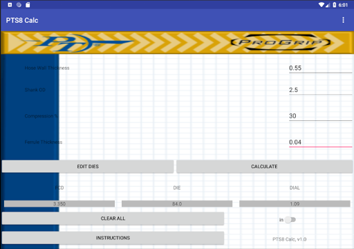 أدخل سمك جدار الخراطيم، عرقوب المناسبة خارج القطر الخارجي، النسبة المئوية للضغط المرغوبة وسمك جدار الطويق.يقوم التطبيق بحساب قطر التجعيد الأمثل النهائي (FCD) لجميع أنظمة العقص الخرطوم ومجموعة يموت وميكرومتر لاستخدامها لنظام العقص PT Coupling PTS8.