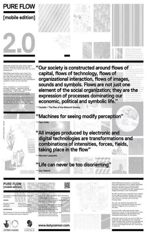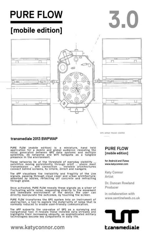 FLOW PURE يحول نظام GPS إلى أداة من التجريد؛ أداة لاستكشاف مادية الضوضاء التي تقل عادة لتمكين سهل الاستعمال الاتصالات. وAPP يفسد استخدام قيمة GPS باعتبارها أداة المسح والملاحية؛ تكشف هذه البيانات والجداول غير مرئية وتسليط الضوء على الوجود المطلق المتزايدة، والتكنولوجيات العسكرية المتقدمة أصبحت المكونات الرئيسية في الحياة اليومية.