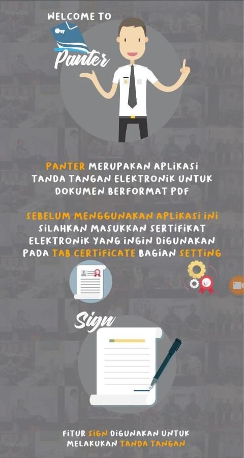 Panter adalah aplikasi yang digunakan untuk membubuhkan tanda tangan digital pada dokumen elektronik dengan jenis file PDF. Dengan menggunakan PANTER pengguna dapat menandatangani dokumen elektronik PDF tidak hanya 1 (satu) dokumen tetapi juga untuk banyak dokumen dalam sekali menekan tombol “Tanda Tangan”. Dengan aplikasi ini, pengguna dapat mengamankan dokumen elektronik PDF dengan efektif dan efisien. Efektif berarti dokumen PDF yang telah ditandatangani telah diamankan dengan memperhatikan aspek autentikasi, integritas data dan anti penyangkalan. Efisien berarti beberapa dokumen PDF dapat ditandatangani secara digital dalam sekali menekan tombol aplikasi. Terdapat Fitur Utama pada aplikasi ini adalah pengguna dapat melakukan tanda tangan digital dengan menggunakan fingerprint.