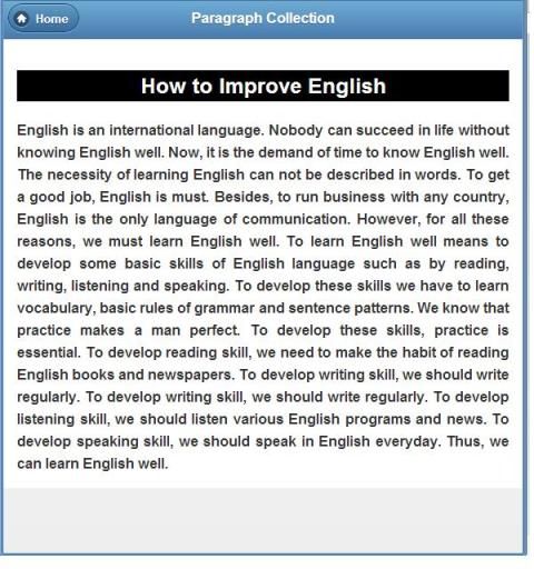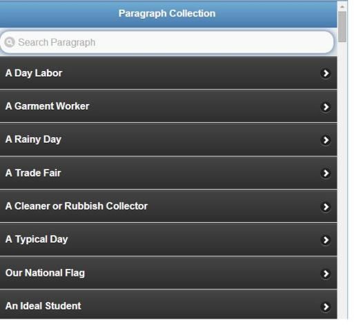 كتابة فقرة جدا مهم كثيرا حين تعلم اللغة الإنجليزية. هناك العديد من الكتب في السوق التي تساعد على قراءة الفقرات. ولكن مجموعة من هذه الكتب هي قليلة جدا في العدد. هناك مئات وستة وعشرين الفقرات في هذا التطبيق. يرصد هذا التطبيق للطلاب بنجلاديش. لكنها يمكن أن تساعد الطلاب في كل البلدان وخاصة الهندية والباكستانية، سري لانكا، والنيبالية الخ وهذا يتضمن الفقرات لفئة الثلاثة للطلاب شهادة الثانوية العامة أو من يحتاج إليه. فإنه قد تساعد المعلمين أثناء التدريس. يمكن أن يكون لديك نظرة على ذلك عندما يشعرون المساعدة.