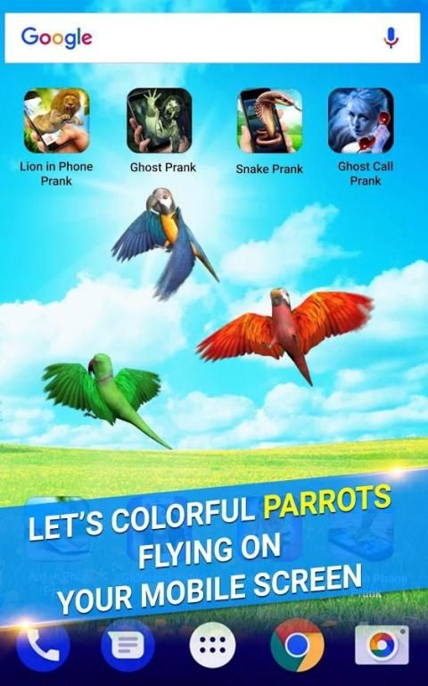 1. الببغاوات على الشاشة - اختار الببغاوات تريد على الطيران على شاشة الهاتف. الببغاوات الملونة تطير حول شاشة الهاتف تسلية لك. ببغاء على الشاشة هو أفضل وسيلة للترفيه عن نفسك مع الببغاوات تحلق على شاشة الهاتف.