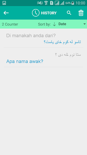 هذا التطبيق المجاني قادر على ترجمة الكلمات والنص من البشتون إلى مالاي، ومن لغة الملايو إلى البشتونية. أفضل تطبيق للترجمة السهلة والسريعة، والتي يمكن استخدامها مثل القاموس. إذا كنت طالبا أو سائحا أو مسافرا، فسيساعدك على تعلم لغة البشتون أو لغة الملايو!